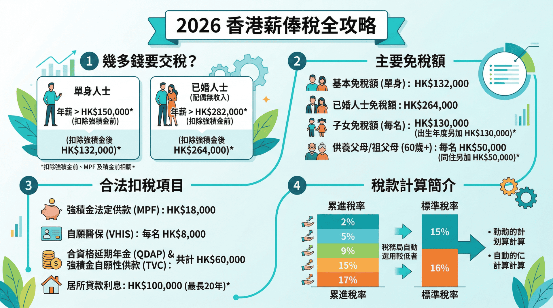 2025/26年度基本免稅額為HK$132,000,已婚人士免稅額為HK$264,000。每名子女免稅額為HK$130,000,子女出生年度可享額外HK$130,000免稅額。供養60歲或以上父母的免稅額為每位HK$50,000。