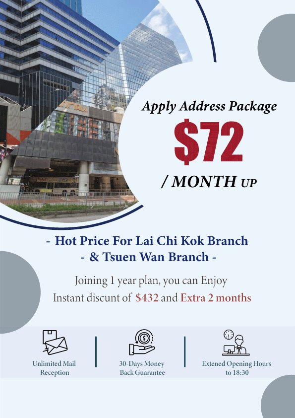 During the promotion period, new customers applying for Lai Chi Kok or Tsuen Wan virtual office address package B, the annual fee for the first year is only HK$1,008, and you will also receive an additional two months of service, averaging just $72 per month.